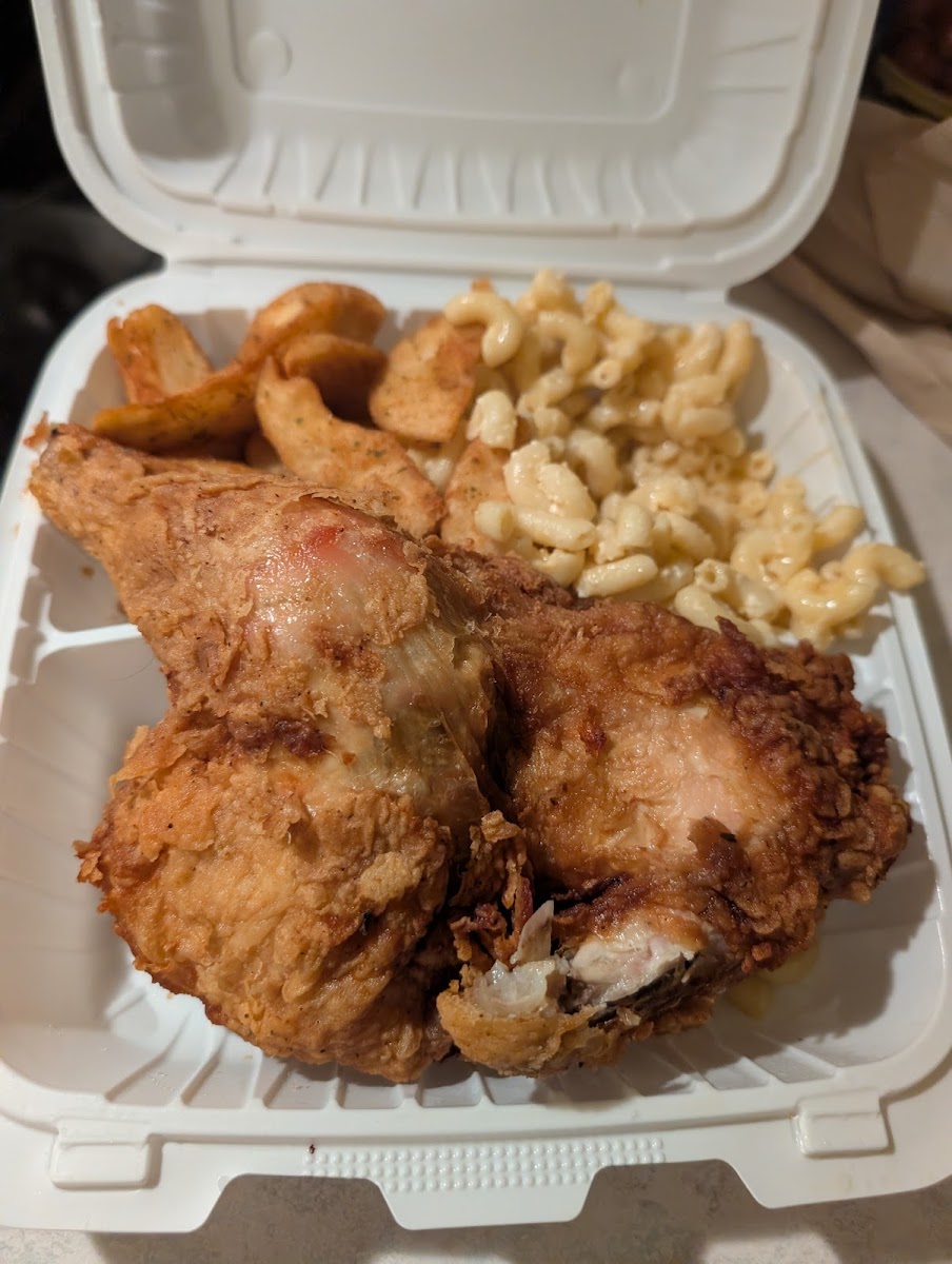 The best fried chicken ever crispy, flavorful and good size pieces of chicken. And the macaroni salad is the best I've ever had the perfect combo add a little hot sauce and enjoy.